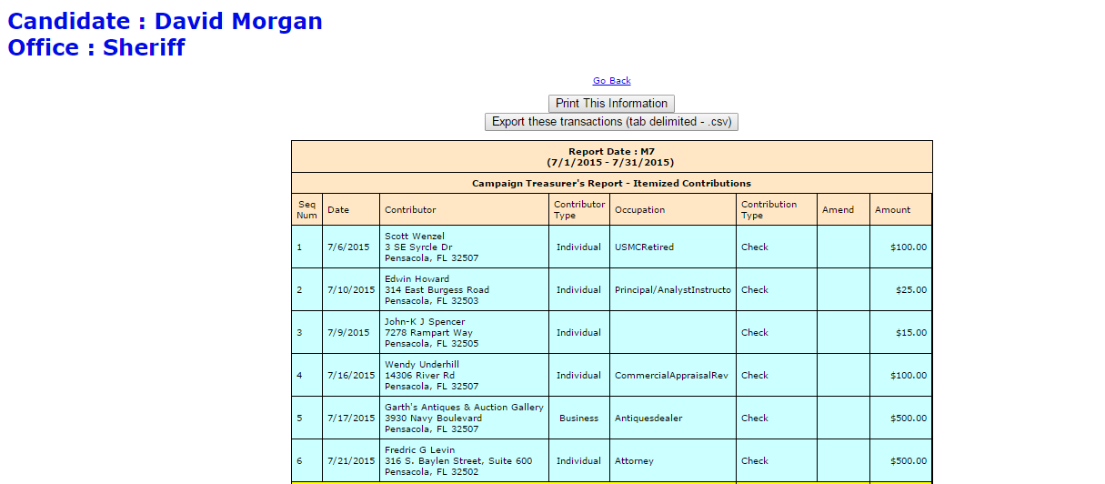 I expressed my concern for the overall perception of Pensacola because of asshats like Morgan and what all he’s doing that is going to be imminently uncovered. I mentioned his financial misappropriation and the sexual discrimination within the Sheriff’s office that is so prevalent that it borders on class action status, according to Marie Mattox. Mr. Levin told me that he had supported Morgan in the past and he realized the image being cast in the public forum that disgraces us all. Morgan being a liability for Pensacola was clear. Mr. Levin seemed unaware of the lawsuits pending by so many employees, particularly women but he suggested that the strongest candidate for Sheriff is John Johnson who announced his official bid yesterday. Mr. Levin suggested I contact Mr. Johnson with all the information I had. He believed that would be the best course of action.