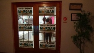 | The inner door decorated with “Re-elect Sheriff Morgan.” Once inside the door, you gave your donation via check and received a receipt. |