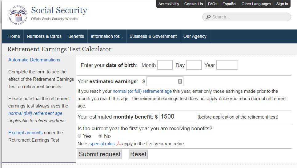 I contacted the Social Security Administration and was directed to their online calculator for benefits, based on birthdate, income and a median Social Security monthly anticipated amount. This is what the form looks like: