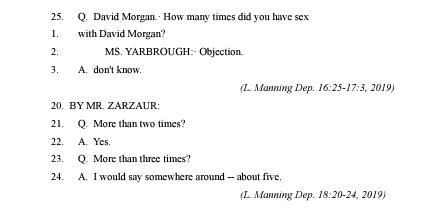 allegations that the Sheriff’s office was deliberately indifferent to the sexual activity between 20 to 30 ECSO deputies and Leah Manning. The allegations include arguments that the Sheriff’s Office Internal Affairs Division purposely ignored a sex ring that was occurring between deputies and Leah Manning, many of whom were visiting the Manning house during work hours.”