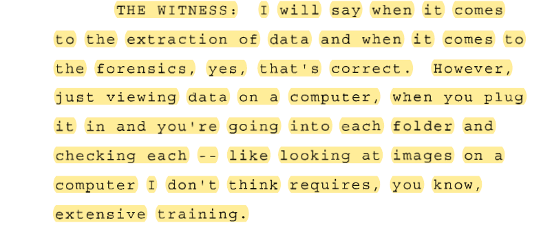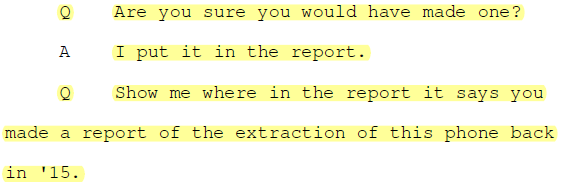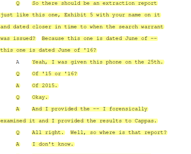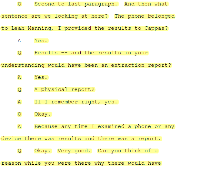 Zach Ward, the first of the two to be deposed, says that chain of evidence was in tact up until the reports he created on the composition of Leah Manning’s devices in this sexual abuse case. In review of the case file, it becomes obvious the reports Ward claim to have run on the evidence he received in 2015 were not in the case file but a second examination of the phone of Leah Manning had been inexplicably run over a year later and was in the file where his report should have been.