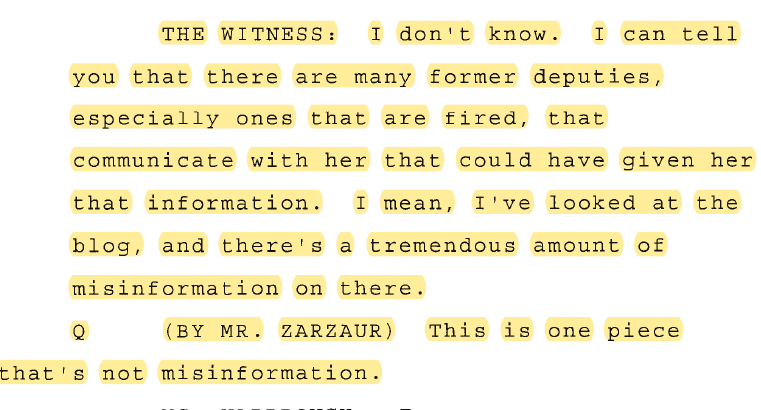 That is some really really amazing circular logic there. From reading this, “Covering for his boss” is about the most obvious thing I read. This deputy could not figure out I was the only person in possession yet this information got it then it must have been him.