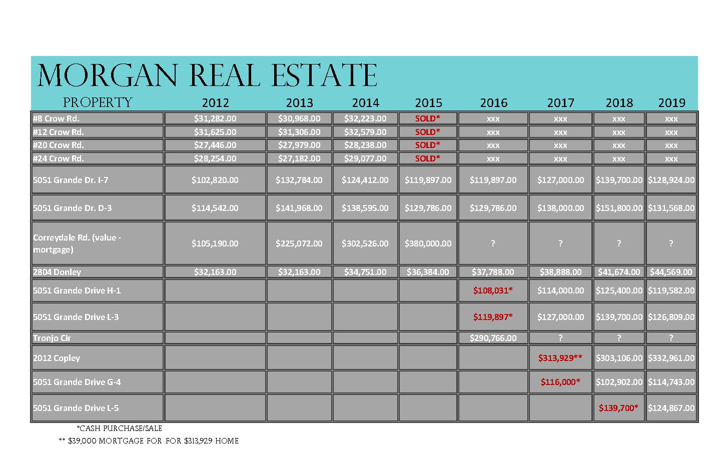 What strikes me are all the properties he purchases with cash (the red figures). Even the custom built home on Copley, he only mortgaged $39K on the $50K property and complete build of this home. How many people do you know that have bought ONE property with cash? Or better yet how many civil servants have you heard of that became millionaires without a significant lifestyle change? Morgan had rental properties prior to being sheriff. He makes $152K a year as his primary job. How did he acquire so much cash and/or property?