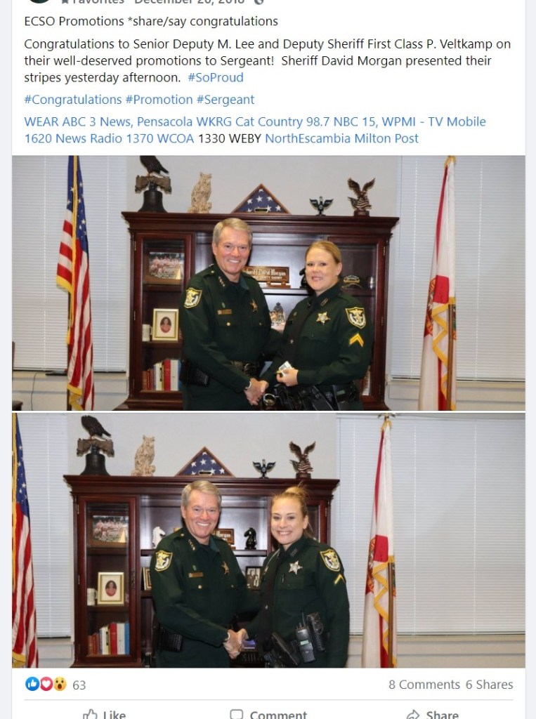 Pam Veltkamp should have been Baker Acted at least twice in the last 3 years, but thanks to her good friend Mindy, she voluntarily committed herself both times. The first time was just prior to her promotion in December 2018. And one other time since then. Each time, Mindy secured her law enforcement standards were preserved. She was assigned as a School Resource Officer, which is one of two places, troublesome deputies are relegated to rather than being fired. The other place is the courthouse. The point is that Mindy should not have gotten special treatment for this chick either time. Psychological fitness is necessary to be a law enforcement officer everywhere. She may be a great person but if she has mental issues, having a badge and a gun makes her a danger to everyone she encounters. Naturally Eric Haines was a part of keeping this lady on the streets because of his closeness to Mindy, his mini-me.