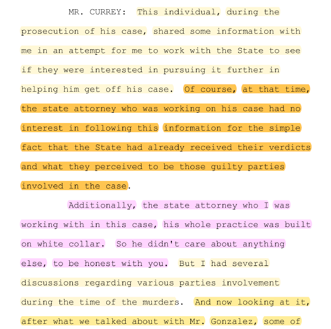 Gonzalez Jr. had a hearing on June 10, 2021. This hearing was to discuss the reason his newly appointed attorney claimed he had a conflict and could not handle his case. The attorney disclosed to Judge Geeker and State Attorney Molchan that he previously represented someone on the periphery of the Billings case in a case unrelated to the murders. This person disclosed info about what happened in the house on that July night to his attorney. Being jammed up, this person had his attorney try to negotiate a deal for him on his case by providing information that would change everything in the Billings cases. Here’s what he says: