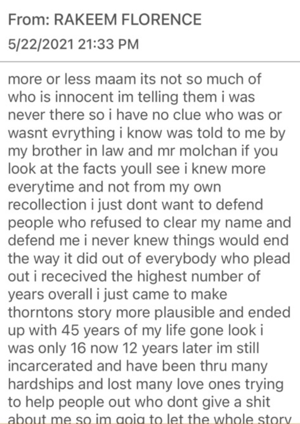 It has already been reported that John Molchan publicly threatened Rakeem Florence with perjury in a capital case if he recants. Not a surprising move since Florence asserts that Molchan directed his testimony. So now, of course, Molchan is trying to prevent him from recanting.