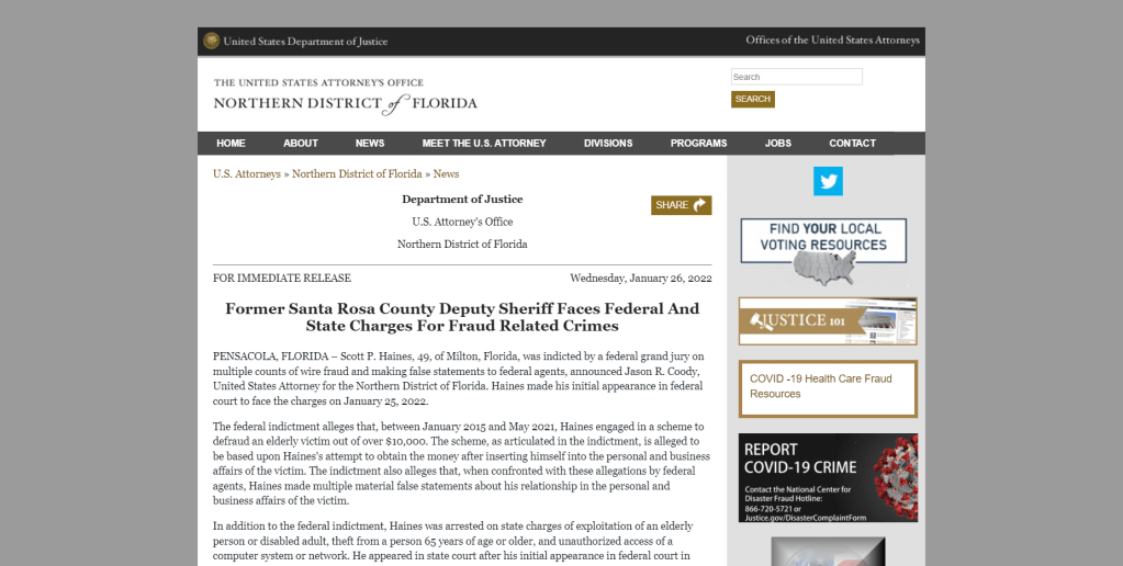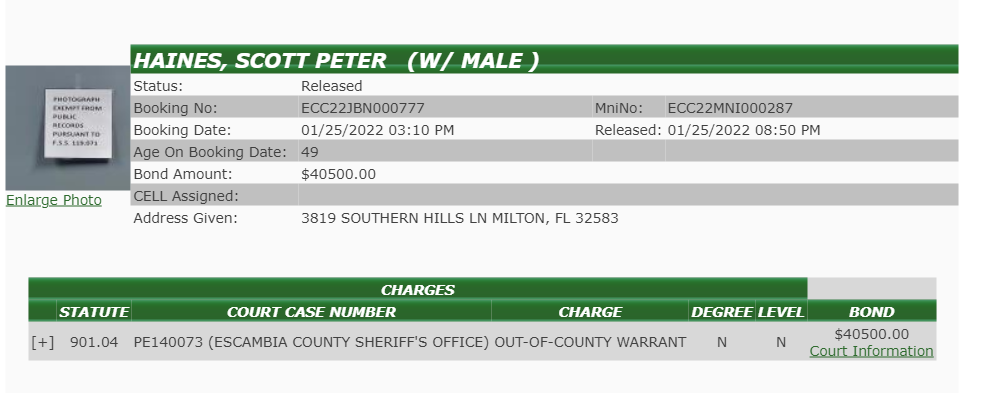 Most people know Scott Haines was arrested by federal marshals. He was eventually turned over to FDLE. Other than the following press release, I haven’t gotten a straight answer on so many things regarding this arrest and Scott’s subsequent release. Here is the Justice Dept’s press release: