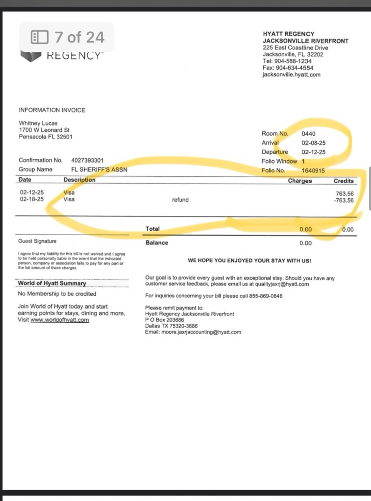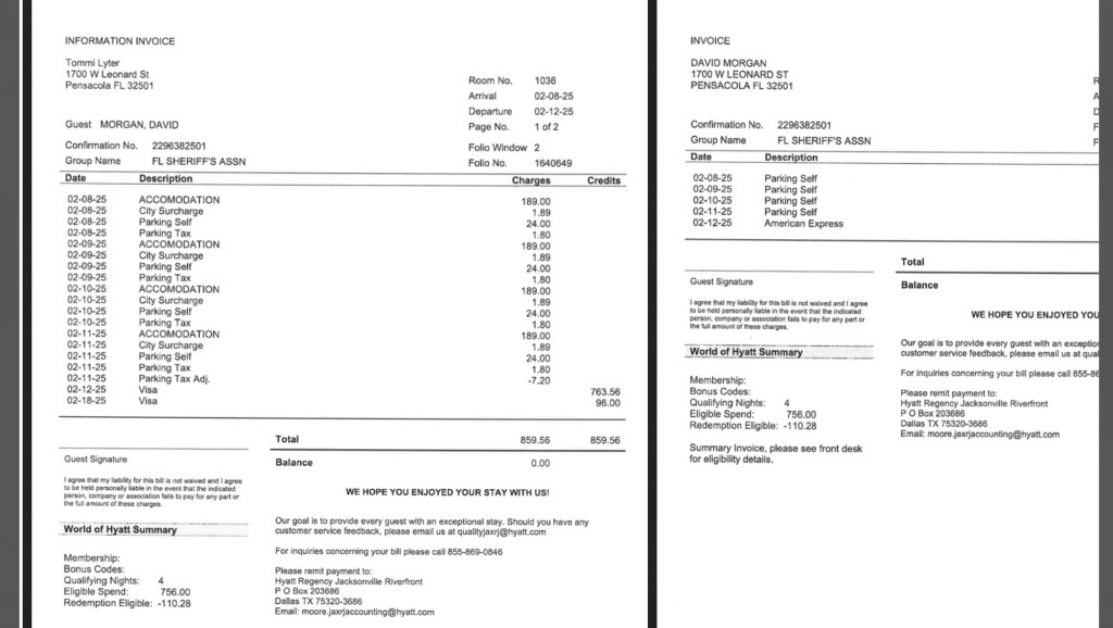 There are 2 particular travel packets that are questionable. The first is from February of this year. It is a conference in Jacksonville that Chitney attended as well as Tommy Lyter. Now remember, I didn’t ask for Tommy’s documentation but Andy Hobbs suggested that they should provide it to me. Let me say I think that was a strategic move. I will show you why.