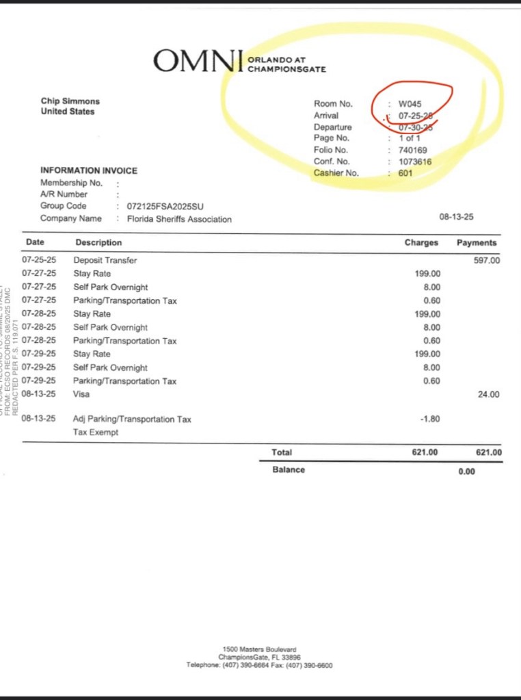 Something is off here. Now the July Packet has one inconsistency. Chip, Whitney and Lyter all attended. The weird thing is the room number. Whitney’s room is 945, Tommy’s is 913. Chip’s is W045. Now in researching the Omni Hotel at Championsgate in Orlando, W045 is not a guest room number. I have no idea what this room is but it is more curious.