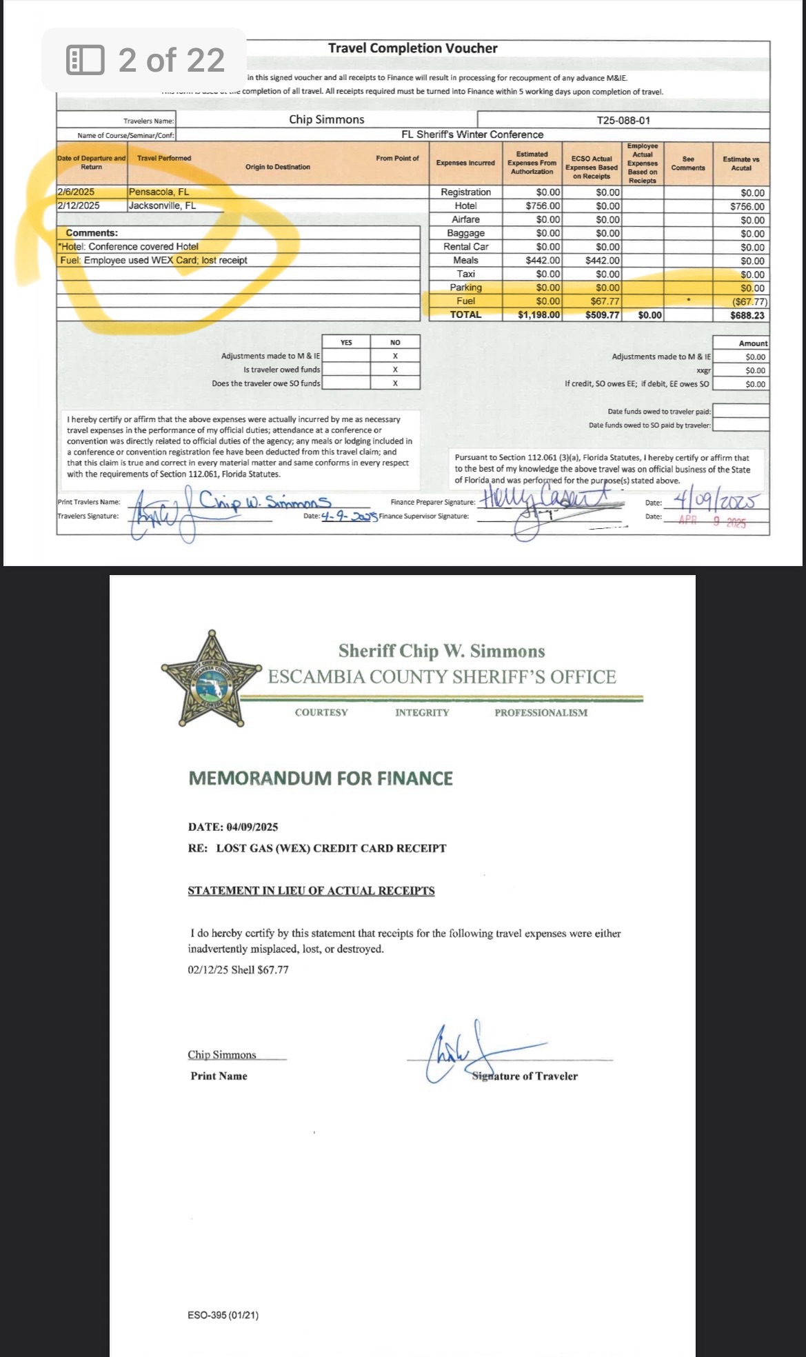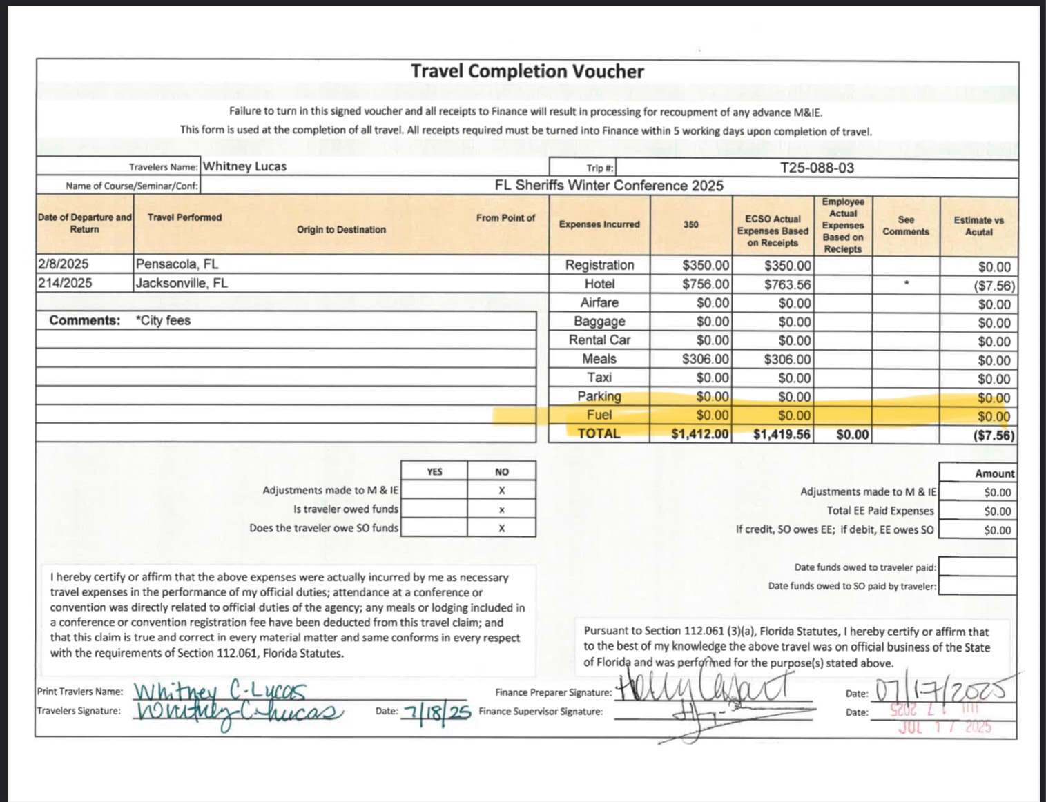 Now I saw this and wondered if that may have been something leftover from when Morgan was Sheriff but surprisingly it was not. Morgan’s name doesn’t appear on Chip’s receipt and he arrived 2 days prior to Tommy. So while this is crazy and maybe it’s something fraudulent like Tommy not attending but Morgan did while Tommy took the per diem and reimbursement for something he doesn’t deserve, that’s not the subject today. And I believe this was a red herring thrown out to make me not look into Chitney. Sorry Andy, it didn’t work.